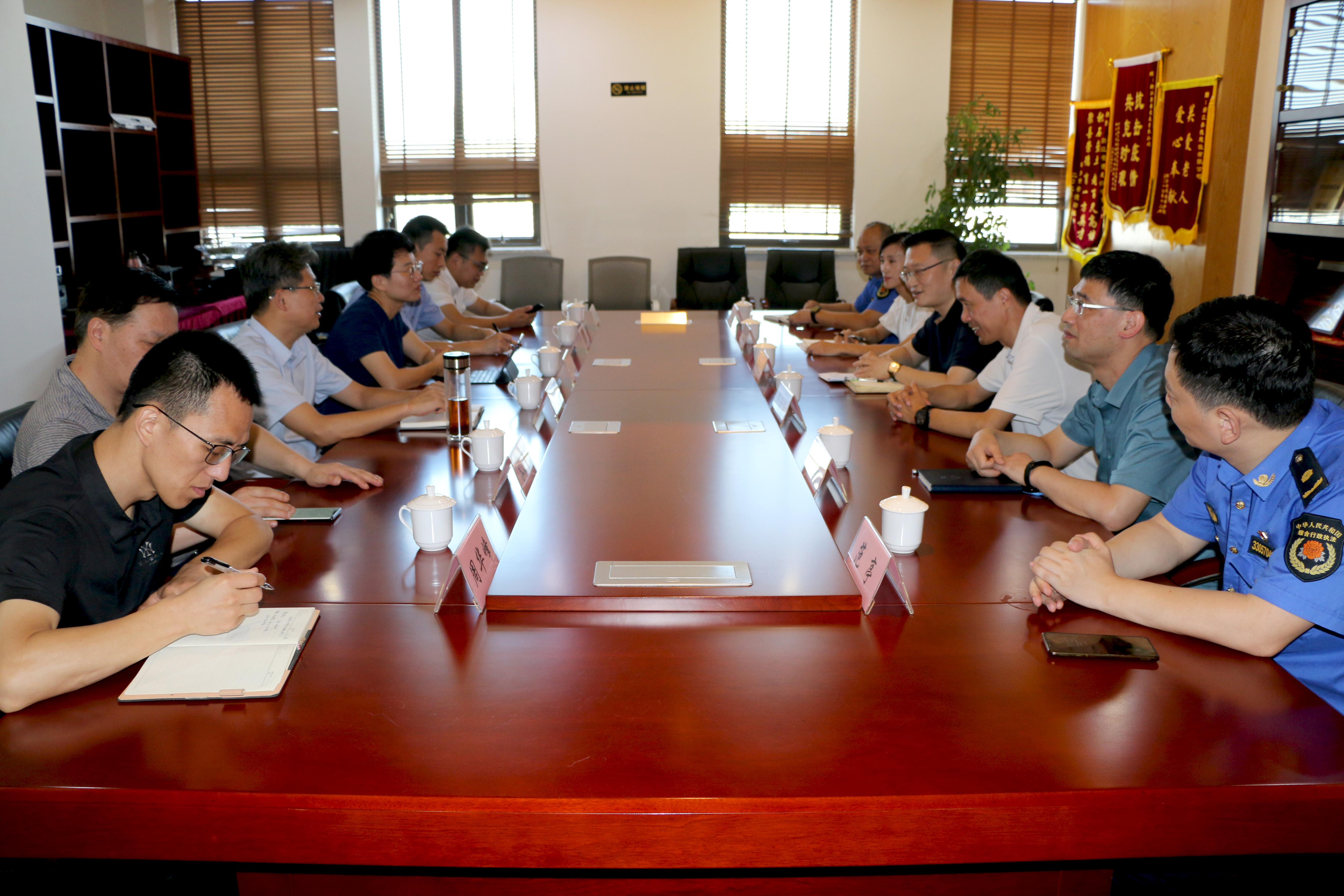 2021年9月18日上午,省司法廳黨委委員、省綜合執法指導辦主任儲厚冰一行蒞臨浙江崇德建設有限公司開展“三服務”調研。嘉興市綜合行政執法局局長顧秋莉,桐鄉市綜合行政執法局局長邱永堂等陪同調研。浙江崇德建設有限公司董事長兼總經理郁振華熱情接待,雙方就企業信用修復方面進行了深入交流。